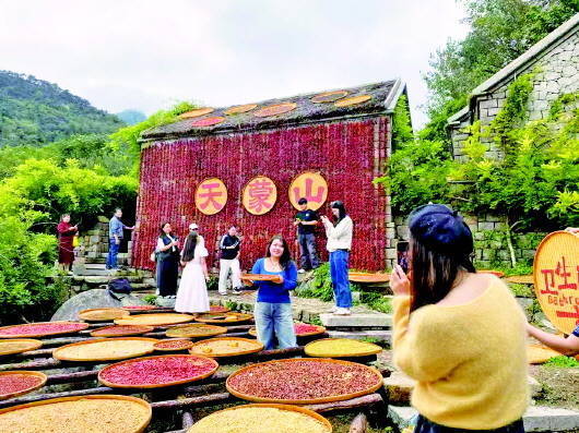 景区将金黄色的玉米、南瓜,火红色的辣椒摆在一起,构成一幅幅五彩斑斓的丰收画卷。