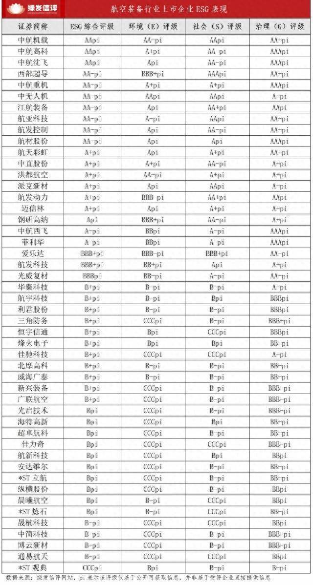 绿发信评主动评级结果显示,中航机载、中航高科、中航沈飞获AApi评级,成为行业标杆;西部超导、中航重机、中无人机、江航装备、航亚科技、航发控制、航材股份七家企业获AA-pi评级;航天彩虹、中直股份等六家企业获A+pi评级;钢研高纳获Api评级;中航西飞、菲利华获A-pi评级;爱乐达、航发科技获BBB+pi评级;光威复材获BBBpi评级。