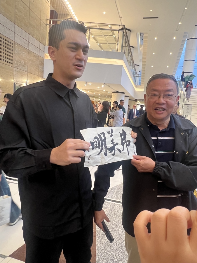 热情跟唱的观众、音乐剧学子史先生(左)和喜欢弗莱明多年并用书法写下她的中文名的粉丝(右)。(姜方摄)