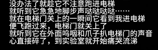 一人一狗反复僵持了一个多小时,最后小姐姐只能趁着它不注意躲进电梯,当电梯关上的那刹那,小姐姐听见门外的小狗边呜呜叫边用爪子巴拉电梯。