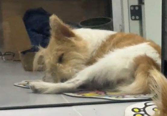 小姐姐伸手摸它,它没有任何反抗,只是静静地趴在她身边,然后安心地睡着了,这一刻它在假装自己有家了。