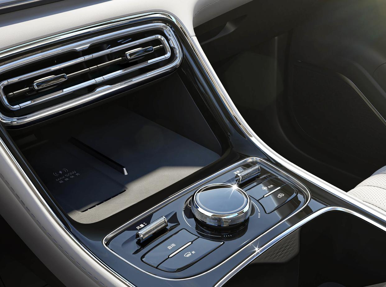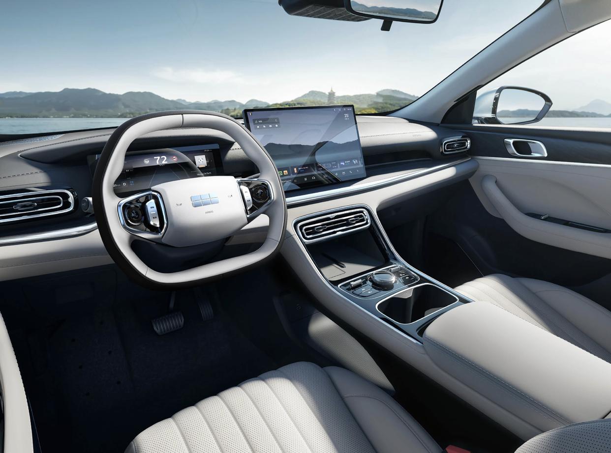吉利银河星耀6座舱采用了大面积低饱和度的米白色软性环保材质铺陈,中控台和门板四周还加入了黑色高级皮革交替混搭,地毯采用了植绒面料,车顶也加入了米白色植绒面料,亮黑色钢琴烤漆装饰面板、银色金属材质的点缀,也显得更有质感。中控台的造型十分简约,配备了吉利汽车四辐式多功能方向盘,中控台配备了全液晶仪表、贴面式中控液晶显示屏、贯穿式空调出风口。配备了沙发座椅,提供了加热、通风功能,前排座椅主打包裹性和支撑性,后排座椅更加舒适。