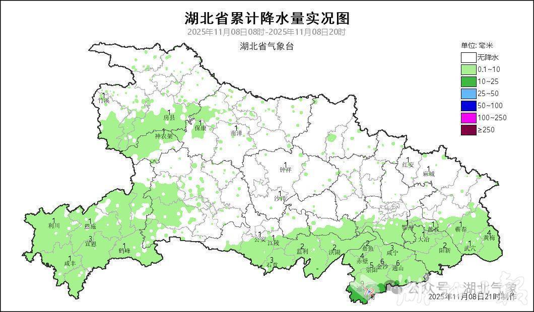 据气象监测,近期湖北持续受阴雨影响,11月8日白天降雨主要集中在东部和南部地区,鄂东南当日最高气温降至15至17℃,局地降幅达10℃,其他地区最高气温多在17至21℃。9日上午,东部和南部地区仍有较强降雨回波,气象部门提醒,计划出行的公众需做好防风防雨准备,驾车人员务必减速慢行,注意路况安全。